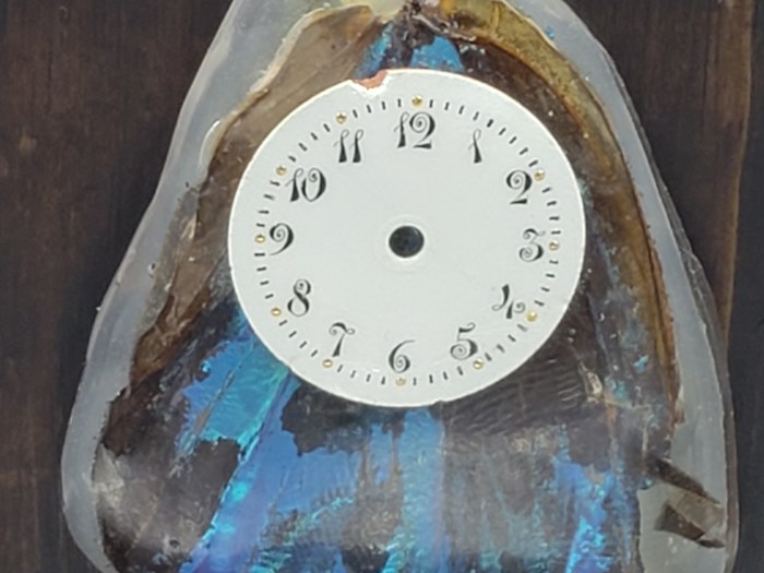 A small white dial is attached to the front of a Blue Morpho Butterfly wing, which has several coats of resin upon it. The resin protects the wing but also allows the scales of the wing to reflect the light in a fantastic way. This has a […]