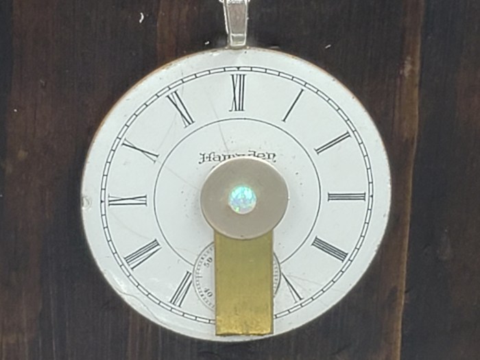 An antique pocket watch dial from the Hampton Watch Company has a brass rectangle attached to the bottom and middle of it. There is an aluminum circle with a single opal in the center. This has a silver-plated bail and chain.