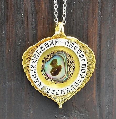 A 24K gold Aspen leaf has a piece of Paua shell attached to the middle. A calendar from an antique wrist watch is attached around it. This hangs with a 24K gold bail.