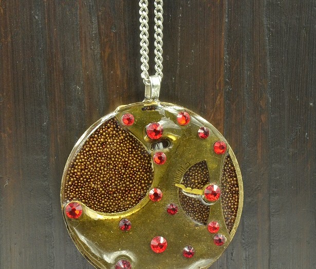 An antique pocket watch case back has been filled with copper beads and resin. The movement plate from a “Dollar Watch” has been attached to the top. Thirteen Swarovski, orange, fire crystals have been attached to the top with a coat of resin. This has […]