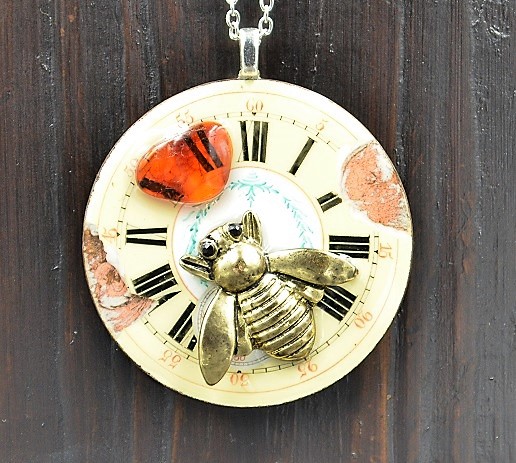 A pocket watch dial made in the 1700’s, sits under a coat of resin. A large piece of amber has been attached to the upper left corner while a metal bee has been attached to the opposite side. This has a silver plated bail on […]