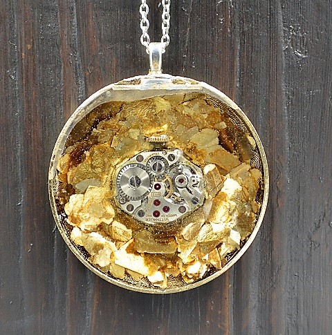 This was a difficult pendant to create. This uses two different watch movement plates and they are attached on the sides to an antique pocket watch spring. In the middle of these pieces, is several coats of resin. In the center of the bottom plate […]