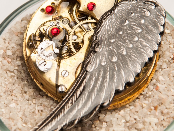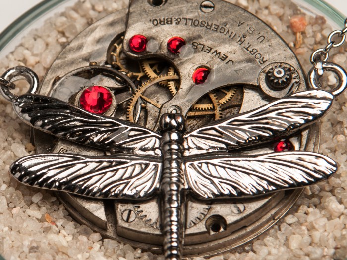 A watch movement made by the Robert H. Ingersoll & Bros. Company, was built in 1921. This mechanism has a coat of resin on it and 5 red Swarovski crystals placed on top. Towards the bottom, is a polished, metal dragonfly. This hangs from a […]