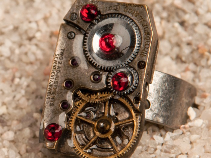 A rectangular, antique watch movement has a coat of resin on top. There are 4 red Swarovski crystals on top which compliment the original rubies, which are still intact in the mechanism. This is attached to a polished, metal, adjustable ring base.