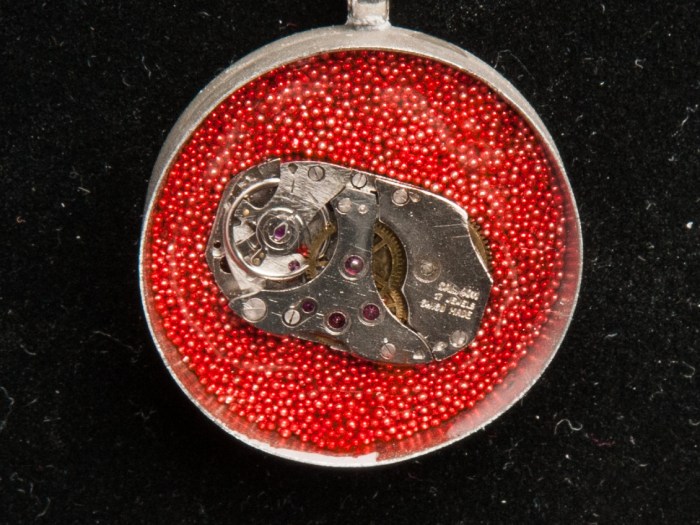 An antique watch movement is encased in resin, while over a layer of red, metal beads. The beads and watch are in an old jeweler’s tin. This hangs from a stainless steel chain.