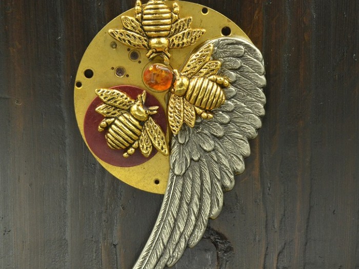This large pendant, was made from the bottom plate piece from an antique pocket watch movement. It has a large metal wing on one side and a piece of amber in the center. Around the amber are three gold plated bee charms. There is a […]