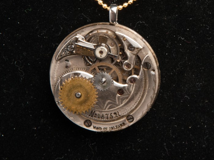 This necklace is made by using a very ornate looking, antique watch movement, with engraved numbers and letters. A complete mystery, the watch has no company name, brand or trademark, but bears the phrase “Maid of Orleans” at the bottom and a serial number of […]