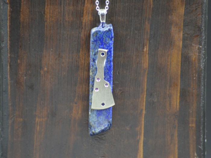 A long bead made of Lapis Lazuli has a silver colored piece attached to the top. The metal piece if from the movement of an antique pocket watch. In the center area of the metal piece, are 3 gemstones that are most likely man-made rubies that were […]
