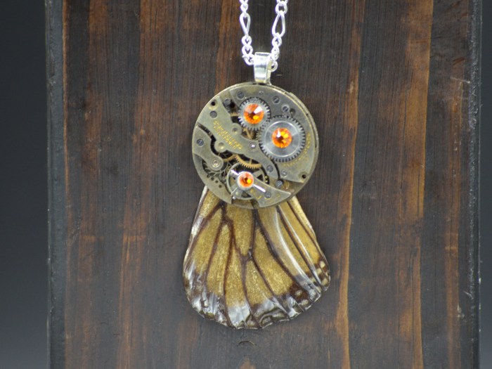 Tiny watch gears and wheels are on a Cicada wing with a clear coat of resin on top of that. This hangs with a silver-plated bail and a chain.
