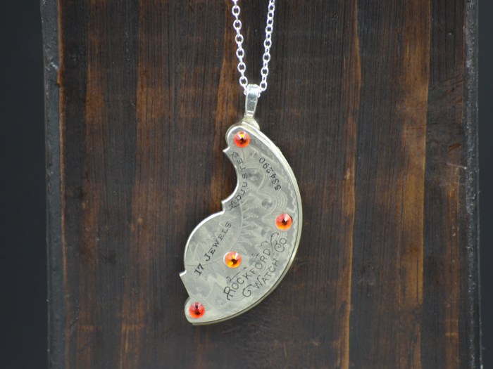 A piece of the watch movement plate of a pocket watch has Fire-colored Swarovski crystals attached to it. The plate is from the Rockford Watch Company and the serial number places it with a production date of 1899. This hangs with a silver-plated bail and chain.