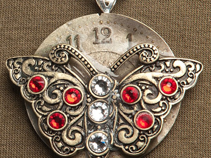A pendant is made from an antique watch part, made by the American Waltham Watch Company, in 1888, sits at the top of this pendant. Below that piece, are two gears and to the right is a single, red Swarovski crystal. This pendant hangs from […]