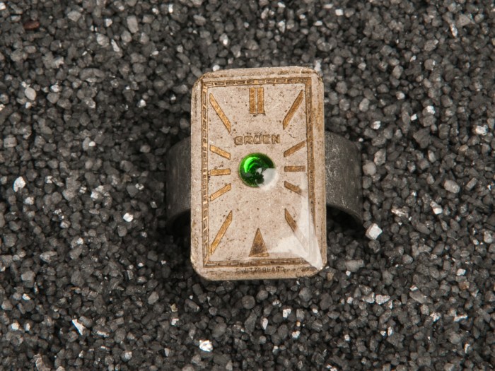 An antique watch dial from the Gruen Watch Company has a coat of resin on it and a single, green Swarovski crystal. It has been attached to an adjustable, metal ring base.