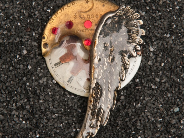 This is a lapel pin that John Bauer has on his personal coat. This pin has an antique, enamel coated, copper, pocket watch dial as the base. A silver colored spring case is in the center, a watch plate part is on the upper side […]