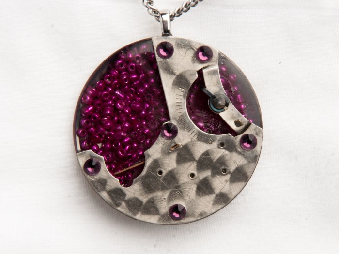 This is a pendant made by taking an antique, pocket watch backing and filling it with metal beads that are a colored in a mixture of pink and purple. These are coated with resin to make them smooth. Then, a plate from a “Dollar watch”, […]