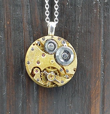 This antique watch movement is Swiss made and has a golden colored metal. It still has the original dial on the opposite side. This has a silver plated bail and hangs with a silver plated chain.