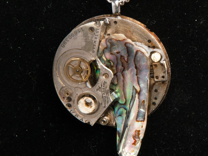 This necklace is made with an antique pocket watch back plate with a different antique pocket watch part on top. Then, a gear and a white topaz sit on the side with a coat of resin. A long, Paua shell piece sits on the opposite […]