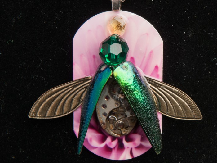 A necklace is made by making a jeweled beetle and attaching it to a dog tag. The dog tag has a flower image on it and on top of that is the beetle over a coat of resin. The body of the beetle is made […]