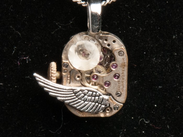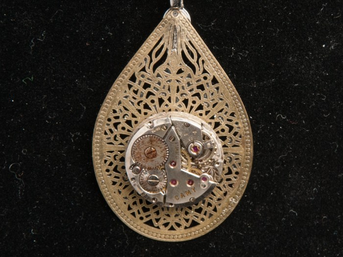 This necklace is made by using a very ornate looking, antique watch movement, with engraved numbers and letters. A complete mystery, the watch has no company name, brand or trademark, but bears the phrase “Maid of Orleans” at the bottom and a serial number of […]