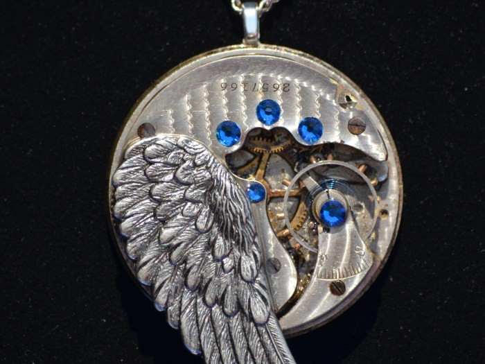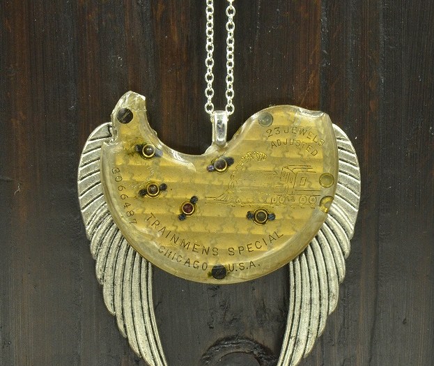 This is just a pendant that is made from a large plate from the movement of a Trainmen’s special pocket watch. That plate has been coated in resin and has two metal wings attached to either side. There is a silver plated bail on the […]
