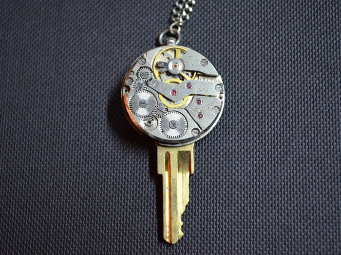 An antique 1930’s watch movement has been attached to the top of an unused key. The shape it makes reminds me of an Art Deco style. This hangs with a silver plated bail and a stainless steel chain.