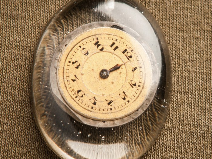 An antique wrist watch movement is encased in an oval of resin. Both sides of the movement can be seen as on one side the movement and mechanism can be seen and on the other side has the original watch dial still. This appears to […]
