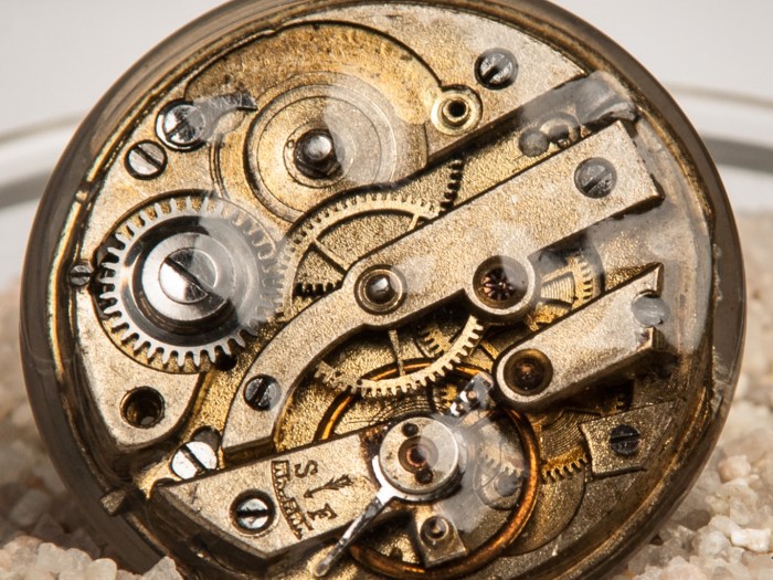 This is a smaller watch movement from an antique pocket watch. This piece still has the pieces and parts intact, as one can see by looking at it. It has a coat of a thick resin forming a dome over the movement. This is then […]