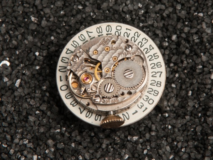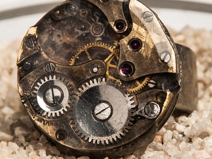 An antique Caravelle watch movement from the 1930’s is placed within a round calendar piece of another watch. This is then attached to an adjustable, metal ring base.
