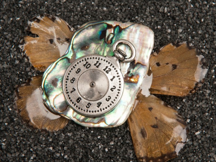 This is a Pewter clockface, colored as antique silver, with a spring case in the center. This is then placed on top of a Paua sea shell. This is then attached to a set of butterfly wings. Everything is coated in resin to make it […]