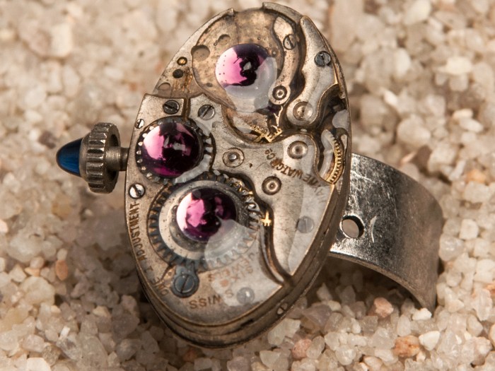 This ring is made using a watch movement from the Hayne Watch Company. The movement was made in the 1920’s and still has the original crown and stem attached. This piece was coated in resin and has 3 purple Swarovski crystals on top of it. […]