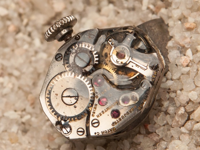 This watch movement is signed at the top by the American Watham Watch Company which operated out of Waltham, Massachusetts. This mechanism has a serial number matching it to the production year of 1884. It has a thin coat of resin on it along with […]