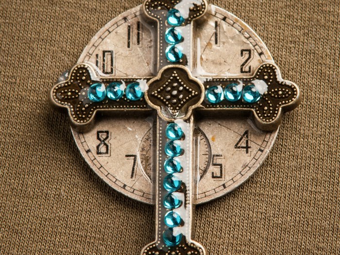 An aged, metal watch dial, from the 1920’s, has a strong coat of resin over it. A large bronze cross has been attached to the front of it. That cross has blue Swarovski crystals lining the inside of it, outward. A coat of resin is […]