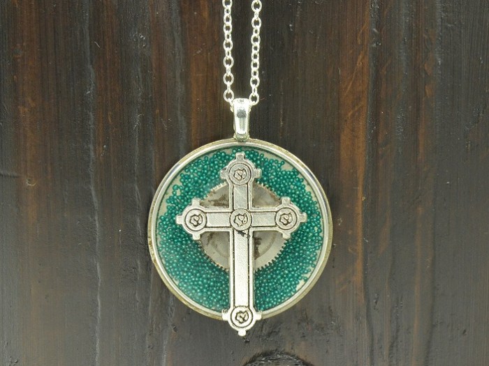 This pendant was made using a small antique watch case back that was filled with green, metal beads and resin. On top of that a watch gear was attached and then a metal cross on top of that. This has a silver plated bail on […]