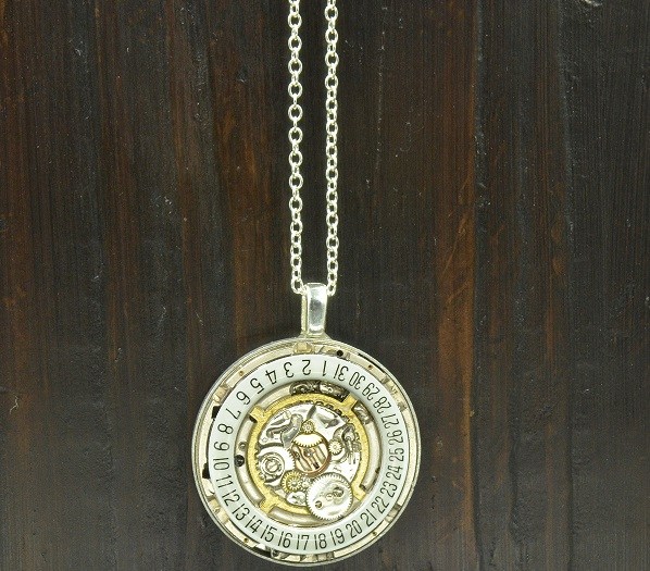 This is an antique watch movement, that is coated in resin. A calendar ring is on the outside. This shiny pendant has a silver plated bail on the back.
