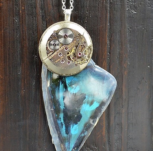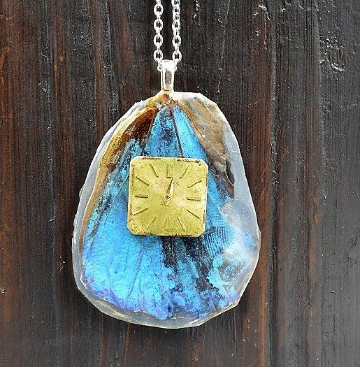 This necklace was made using the bottom wing portion of a blue Morpho butterfly. The wing has several layers of resin over it and it has an antique, gold-colored, metal watch dial, attached to the top. There is a thin coat of resin over the […]
