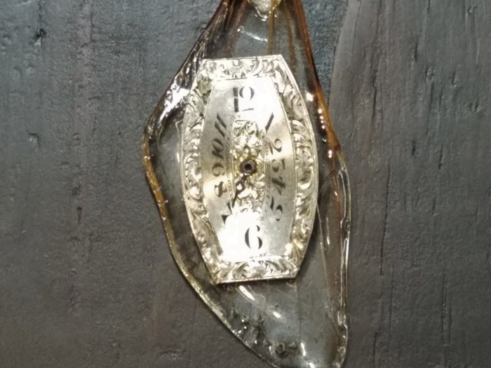 A Cicada wing, coated in resin to make it clear as glass, has an antique watch dial attached to the front. This has a silver bail attached to the back.