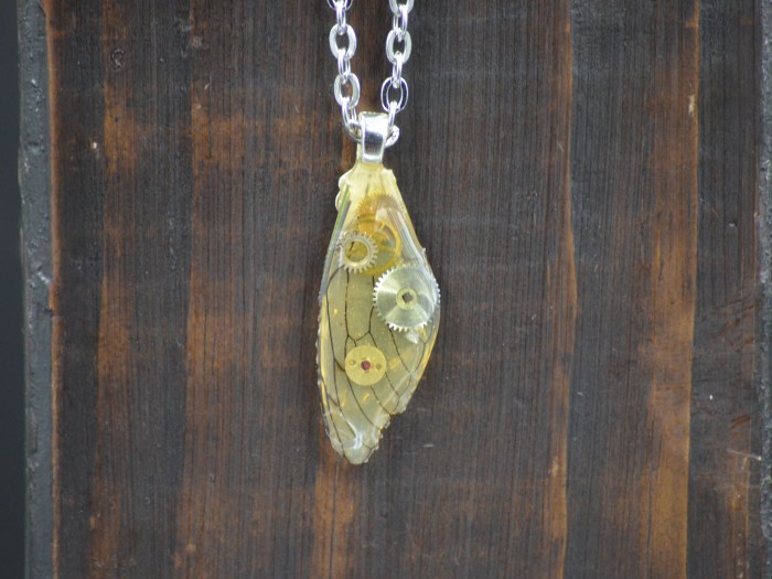 Tiny watch gears and wheels are on a Cicada wing with a clear coat of resin on top of that. This hangs with a silver-plated bail and a chain.