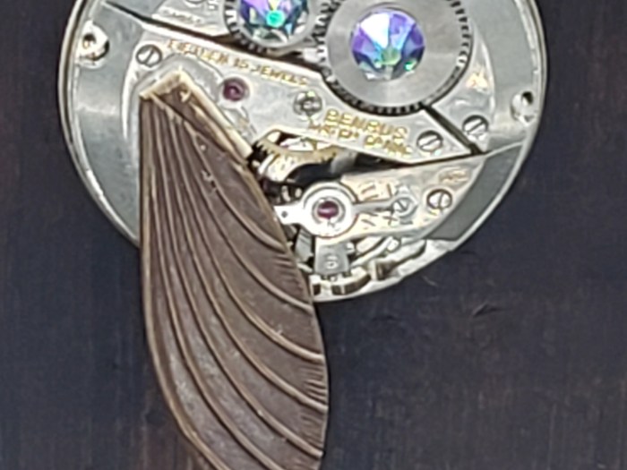 This tiny ladies watch movement has a larger copper-colored metal wing attached near the bottom. This hangs with a silver-plated bail and chain.