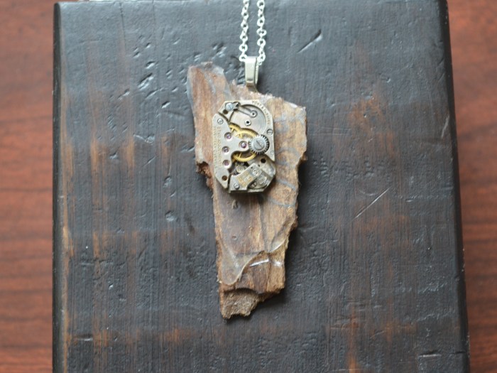 A resin coated piece of bark, from a tree, has a rectangle shaped wrist watch movement attached near the top. This is a true merging of metal and nature. This hangs with a silver plated bail and chain.